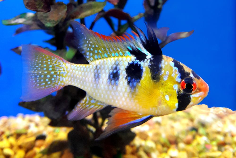 Ramirezi, atau sering dipanggil “butterfly cichlid,” punya warna cerah dengan cakar kuning khasnya. Cantik banget buat dijadiin pusat perhatian di akuarium kalian!